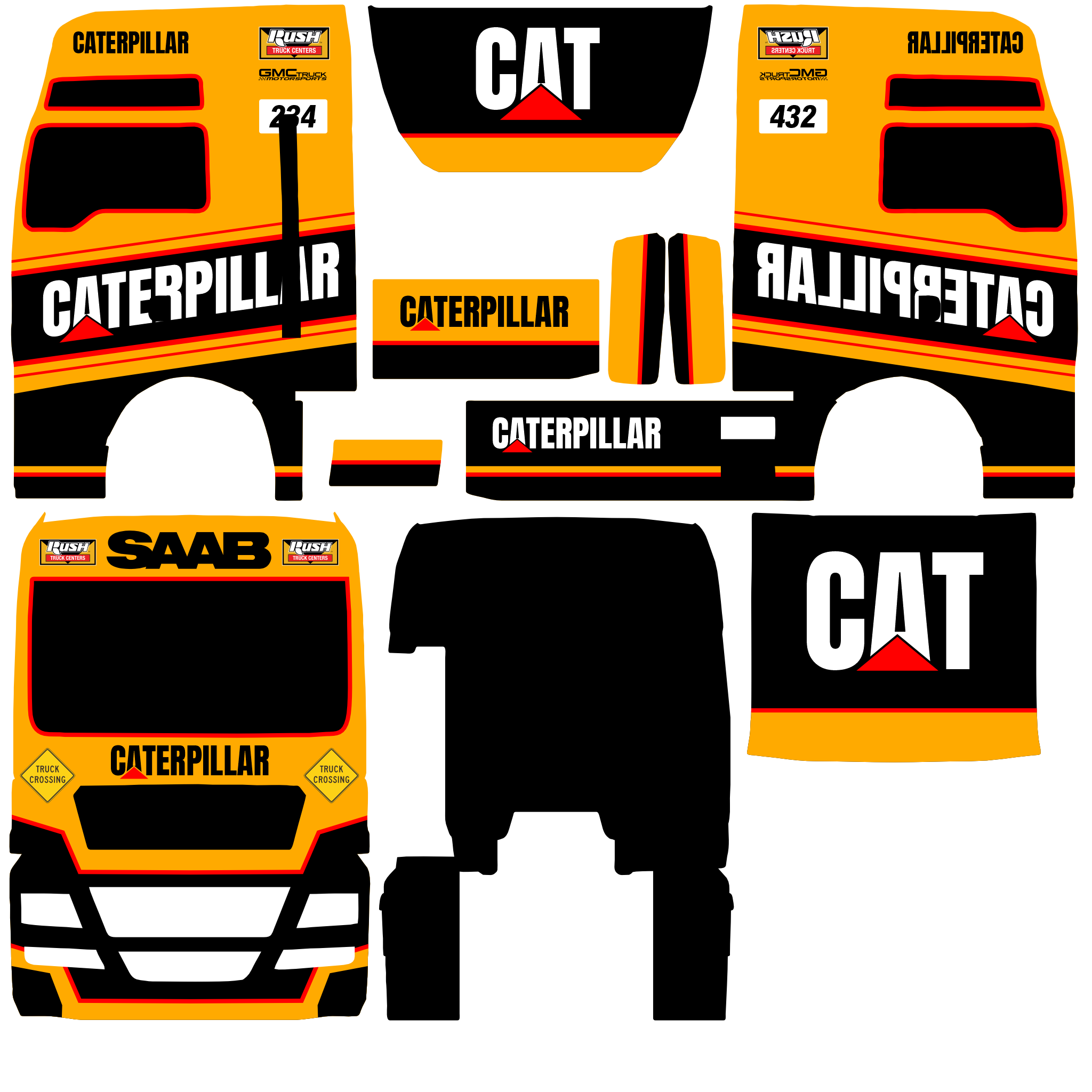 Truk ini menggunakan livery Caterpillar dengan dominasi warna kuning, hitam, dan merah, yang memberi kesan kuat dan industrial. Di bagian samping dan depan kabin, terdapat tulisan besar "CATERPILLAR" serta logo khasnya, memberikan nuansa branding yang kuat. Sentuhan garis diagonal merah dan hitam memperkuat tampilan balap dan kecepatan. Truk ini tampak seperti kendaraan untuk rally truck atau heavy-duty event. Cocok banget buat penggemar dunia otomotif berat dan konstruksi!