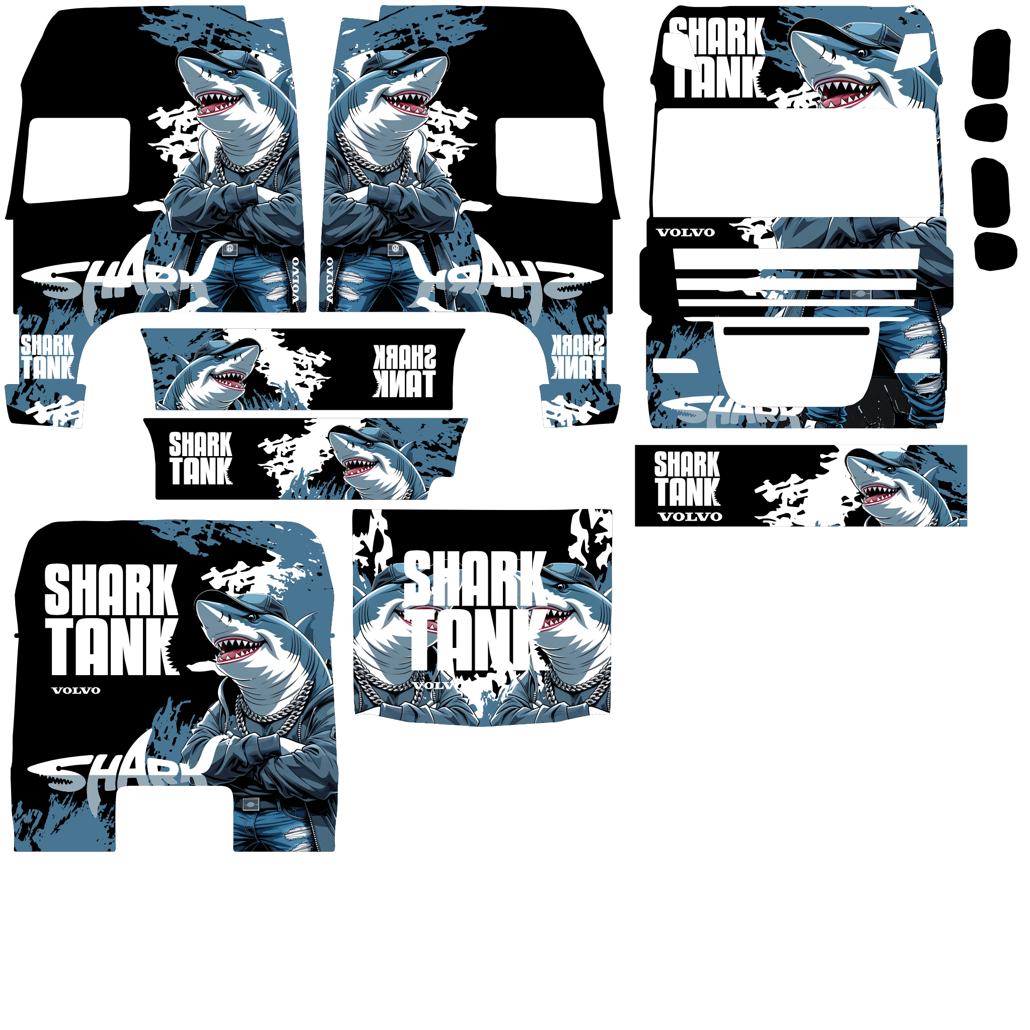 Skin truck ini menampilkan desain bertema hiu (shark) dengan dominasi warna biru tua dan hitam, memberi kesan garang dan agresif. Di bagian samping dan depan kabin, terdapat ilustrasi hiu dengan mulut terbuka dan tulisan besar seperti "SHARK" dan "SHARK TANK", menambah kesan kuat dan mencolok. Desain ini cocok untuk memberi identitas yang unik dan berani pada truk.
