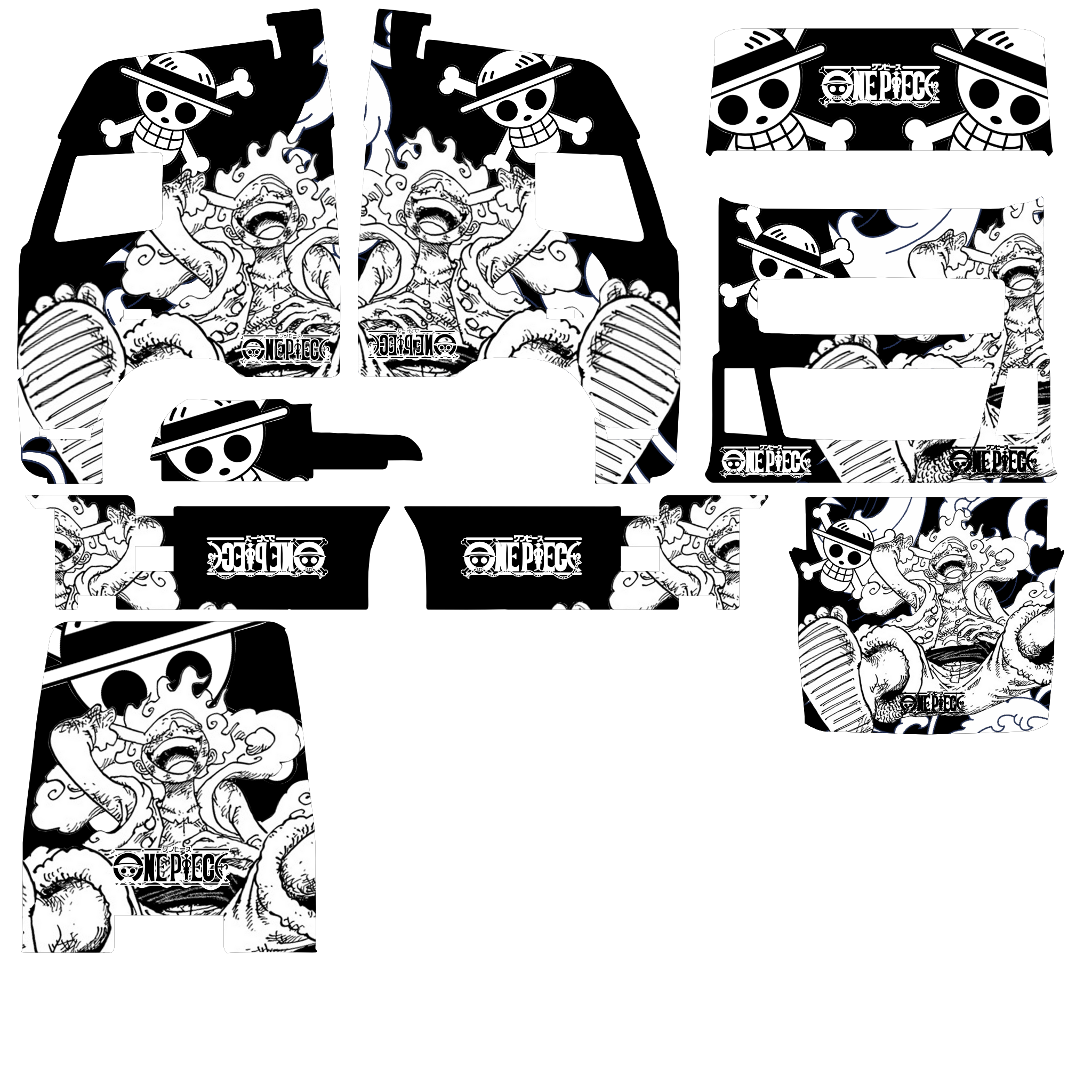 Skin truk ini menampilkan desain bertema anime monokrom, dengan karakter dan simbol ikonik dari serial terkenal One Piece. Bagian kabin dihiasi ilustrasi detail, termasuk logo Bajak Laut Topi Jerami (Jolly Roger) yang sangat dikenal, memberikan tampilan yang mencolok dan mudah dikenali. Kombinasi warna hitam, putih, dan abu-abu memberi kesan keren dan bergaya, cocok untuk penggemar anime dan grafis bergaya street art.